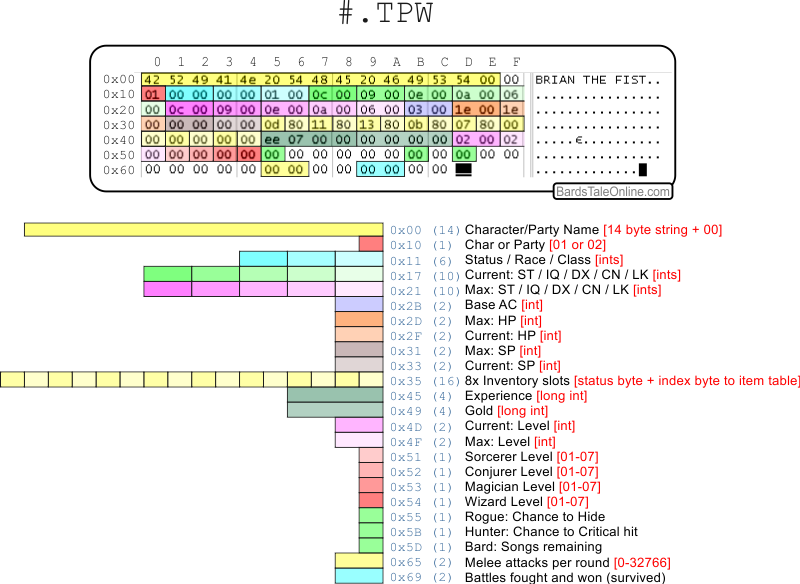 Example: An equipped Wargloves would appear stored as [80 5B]. An unindentified Travelhelm would be seen as "Helmet" in-game, and stored as [40 73].